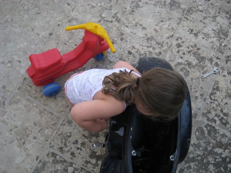 un ultima cosa, ho smontato le vespa per tre ore con mia figlia di tre anni che ad ogni passaggio protestava : Ehi non puoi smontare la sella , se no la mamma come va sulla sua vespa?Ehi, non smontare il faro, se no, ecc ecc ecc. troppo da ridere, notare, lei era seduta sulla sua di vespa mentre diceva questo. va beh, vi posto le foto , aiutatemi a finire bene questa fase.
