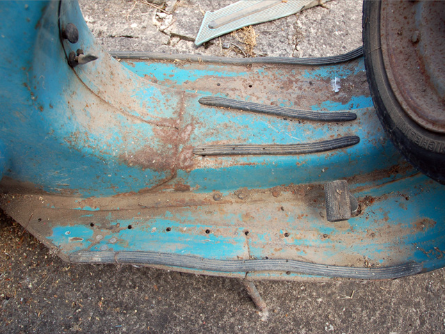 ecco le foto della "quarantenne" ('68), la vedrei bene di un bel Giallo Positano (1.298.2902), a questo punto bisogna solo decidere se farla rivivere. Nel caso avrei bisogno di qualche(molti...) consiglio, per partire secondo voi l'iter quale sarebbe: meccanico / carrozziere per spianare qualche bottarella e ricostruire le pedene / sabbiatore / di nuovo carrozziere per verniciarla (nitro o acqua in prospettiva )... e quale sarebbe una cifra da preventivare? Ad una prima analisi inoltre il n° di telaio sembrerebbe compromesso... In attesa, grazie.