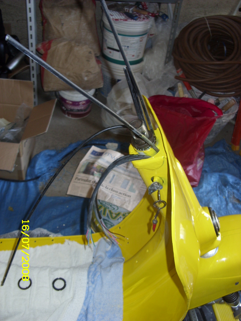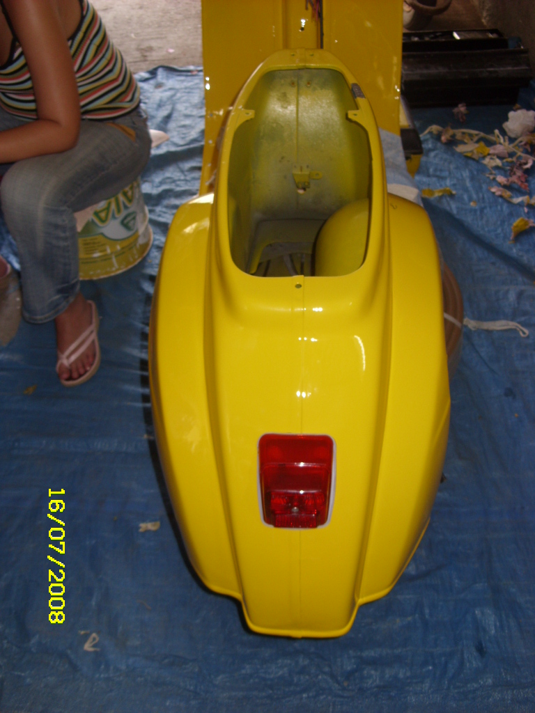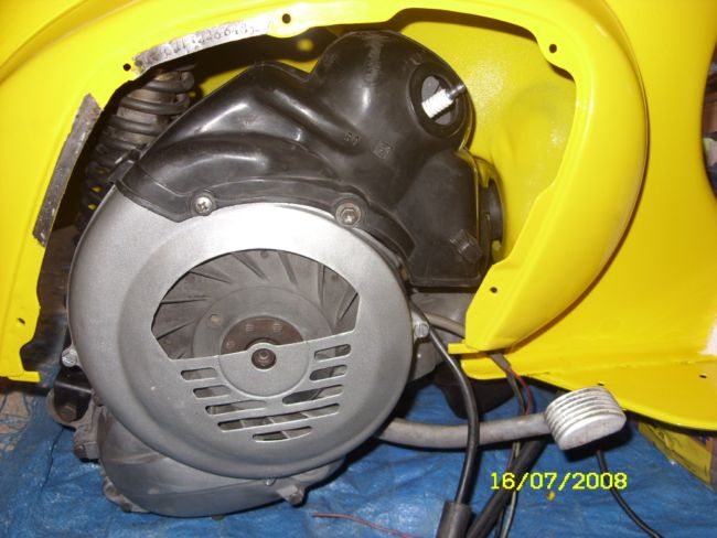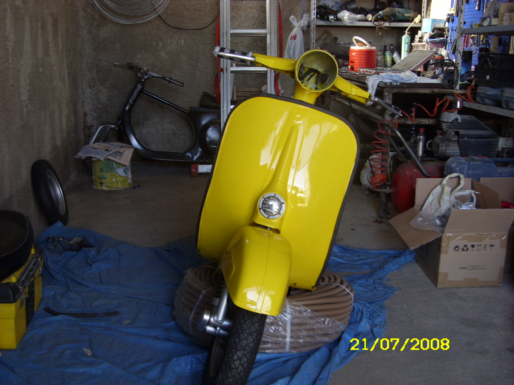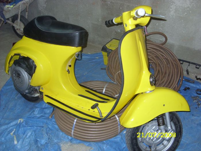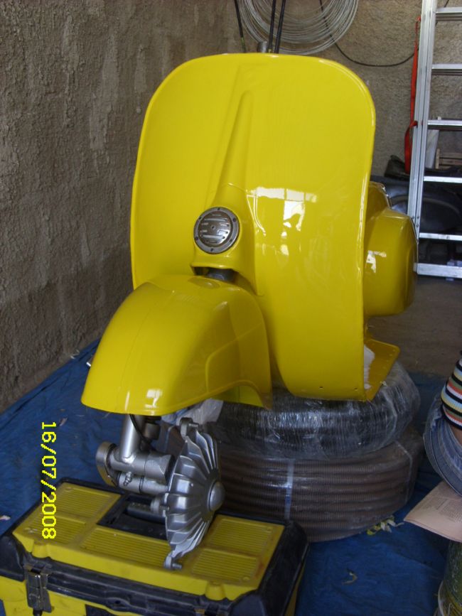 Certo i mozzi,i tamburi , cerchi e ruote sono da 10" .....non sono riuscito a reperirli i suoi originali da 9" cerchione chiuso a 4 bulloni! Il bordoscudo non sono riuscito a montarlo quello d'alluminio originale ed ho messo quello che vedete che secondo me non ci sta malaccio  visto che la vespa e' gialla con liste pedana nere