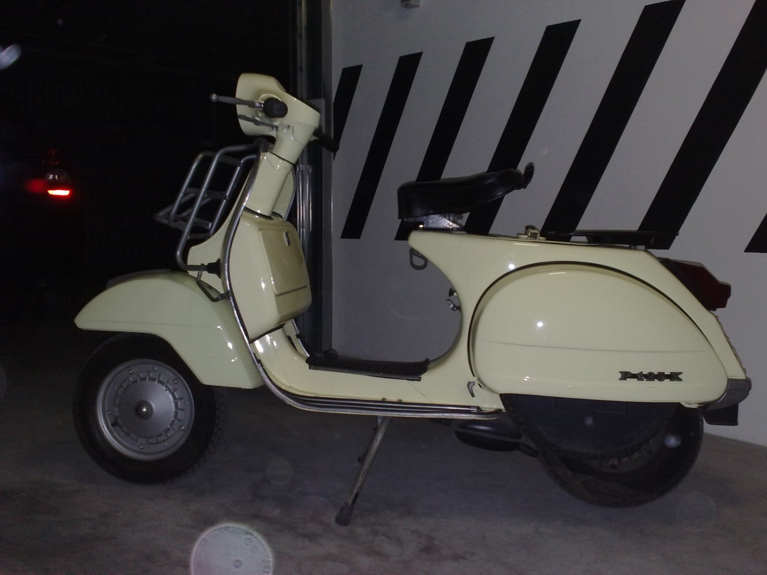 E'la mia P125X, mi fu regalata a 16 anni dai miei genitori, è datata marzo 1978 ed è la prima versione prodotta, infatti non ha le frecce e nemmeno il notolino per la chiave sopra il coperchio manubrio, quanti ricordi..., non la darei via nemmeno per 1.000.000 di euro! Da allora tante moto sono passate e vendute.. lei sempre fedele nel box in attesa che mi venisse nuovamente la voglia di farle fare un giretto, come ai vecchi tempi... Purtroppo alcuni anni fa ho fatto la grandissima cazzata di cambiarLe colore, originariamente era biancospino, ho deciso di darla per una rinfrescata ad un amico carrozziere (CANE) che mi ha convinto a cambiare tinta... vabbè... tanto prima o poi ho in testa di trovare il tempo per smontarmela tutta per una restaurata coi fiocchi... (sabbiatura e verniciatura original). Per ora me la godo così, è fantastica ugualmente... Un saluto a tutti i Vespisti Forever... CIAO