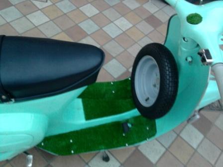 è erba sintetica con cerata non trspirante così non passa l'acqua ..li ho avvitati seguendo i buchi originali...a breve sul praticello nel tappo manubrio ( il suo originale è a casa questo è un tappo compatibile pessimo che ho rivestito) una PALLINA DA GOLF
