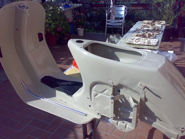 sono andato con la luce a vedere il telaio che sono appena tonrato da lavoro..non riuscivo a resistere..anche a me sembrava chiara, ma mi sa che si è leggermente scurita..comunque non è bianco spino è proprio color sabbia...Mi ero fatto fare 1,5 kg di colore ma cavoli erano veramente tanti ..con 1KG di colore e mezzo di catalizzatore ne avevo di avanzo...vuol dire che devo trovare un altra vespa da far di quel colore no ???   ahahahah