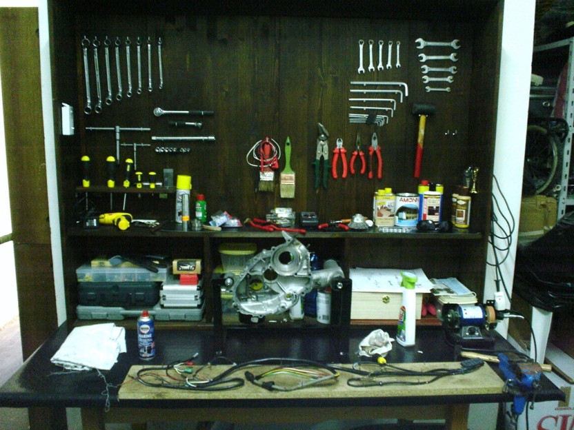 non ho potuto ancora sabbiare la vespa che vedete sotto al banco da lavoro "nuovo, posterò le foto domani" perchè erano tutti in ferie...