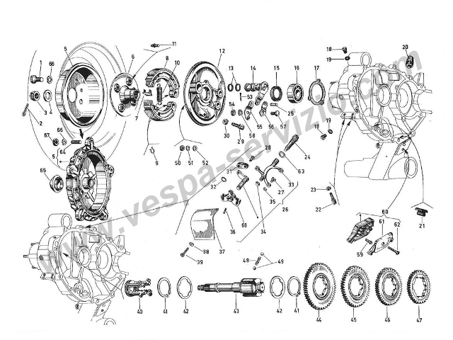 rieccomi qui..smontanto il preselettore marce non ho trovato la rondella (n63)...guardate lo spaccato. Questa rondella va fuori o dentro il carter?