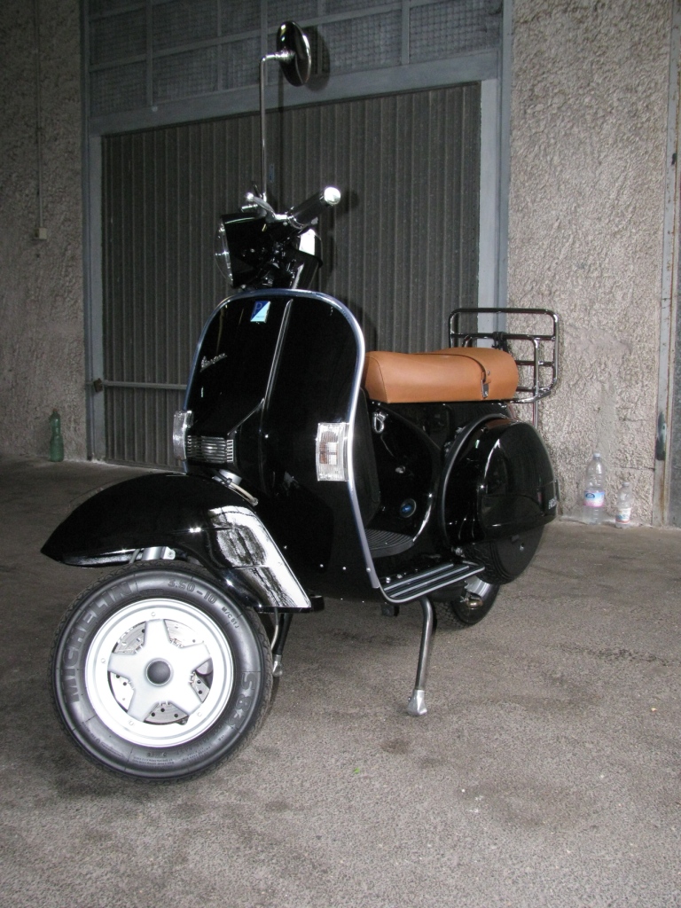 E finalmente dopo tanto tempo posso ripresentarvi la mia vespa! Ne sono molto orgoglioso. E' venuta proprio bella! Mi manca solo il tappo del mozzo posteriore che mi sono perso nel giro di prova... In effetti devo dire che l'ho finita già qualche tempo fa, ma una fastidiosissima perdita dal carburatore mi ha costretto a rimetterci le mani. Con l'occasione ho montato una sorta di catetere che evita che l'olio accumulato nella vaschetta vada ad imbrattare il motore, sempre sperando che comunque non debba mai entrare in funzione... Una volta finita, la vespa è stata lavata e lucidata con una linea di prodotti professionali della 3M. Mi sono costati l'ira di Dio, ma ve li consiglio davvero perchè sono fantastici! Perdonatemi la qualità delle foto, scattate al volo in un locale semibuio in un piovosissimo weekend. Immagine: