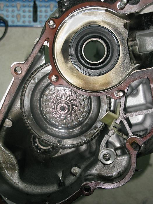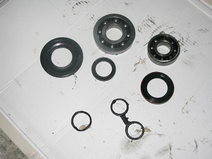 81,33 KB Stasera sono riuscito a togliere i due cuscinetti di banco, anche qui non ho trovato difficoltà: armato con martello e e un dado di grandezza idonea al cuscinetto di quelli che si inseriscono nella chiave a cric ho colpito senza esagerare e con attenzione il dado messo a contatto con il cuscinetto in maniera che la forza potesse essere distribuita in tutta la circonferenza del cuscinetto e piano piano i cuscinetti sono usciti fuori. Non ho neanche riscaldato i carter. naturalmente prima di togliere i cuscinetti ho smontato i paraoli e poi con la pinza adatta ho tolto i seger. Adesso dovro acquistare i due cuscinetti skf 6204 /c4 ed skf 613912 in questa foto si vedono i cuscinetti, i paraoli e gli oring che stanno dietro il coperchio del mozzo posteriore