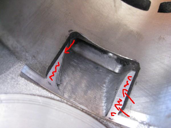 ecco montando il cilindro si nota questo, la zona evidenziata in rosso va asportata per far passare al meglio i gas, oppure l'importante che siano larghi nella zona superiore? Formano un muro?