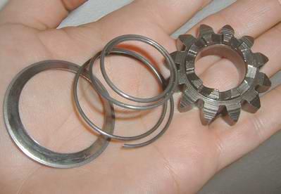 rimonta l'albero sul carter lato volano, battilo bene,e controlla che il quadruplo sia ben inserito nel cuscinetto, dunque allontana il cambio dall'ingranaggio della messa in moto(batti piano sul perno ruota), smonta l'ingranaggio della messa in moto e rimontalo nel seguente ordine: