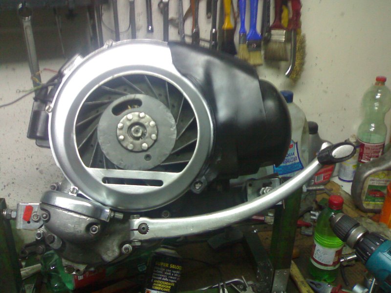 eccoci qui,dopo non so quante ore di lavoro e imprecazioni varie,finalmente il motore è pronto!!!!! non immaginate come era messo male e quante pene ci ha fatto patire,ho dovuto cambiare pure il carter per via delle valvole rigate,ma finalmente ieri sera ha fatto la scintilla! devo ringraziare sentitamente il mitico mimmo,senza di lui non ce l'avrei mai fatta,la sua esperienza,mi è stata di grande aiuto,per non parlarvi della sua bontà e generosità che non hanno eguali e chi lo conosce può confermare. ho ancora dei piccoli dettagli da modificare tipo la bobina che non è quella originale e la leva della messa in moto che è di una rally,ma per ora va bene così,anche perchè non ce la faccio più,voglio vederla finita! quando avrò modo cambierò quei piccoli dettagli