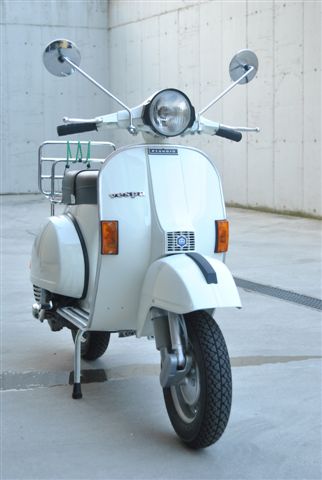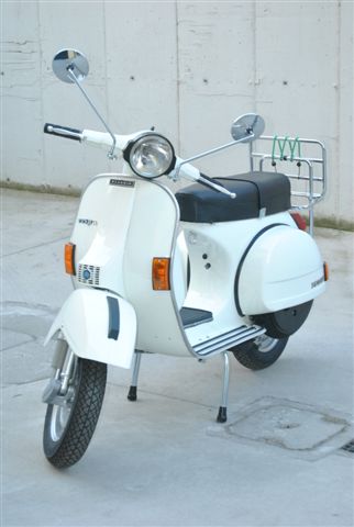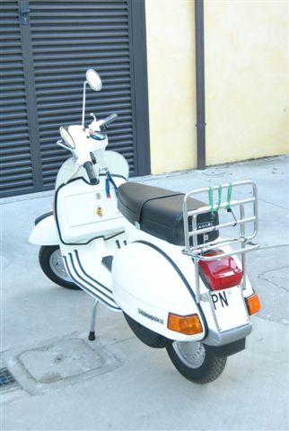 la cresta è di ARCOBALENO, gli specchi in cromo e il portapacchi sono una scelta personale che non condivido, le PX hanno sempre specchi neri FABBRI e portapacco nero sempre FABBRI, che alla fine sono molto più garbati e belli dei chiassosi cromati su di una "Nuova Linea PX" la cornice fanale sulla PX.... te la boccio e non mi piace, l'ammo ant ha la parte superiore dell'ammo in uno strano argento che non decifro...