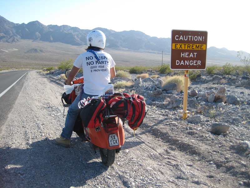 IL GENERALE LEE esce dalla DEATH VALLEY COME UNA FENICE, non stavamo guidando, stavamo volando, verso la vita che tanto amiamo e che questa volta abbiamo veramente rischiato di perdere! Ad una cinquantina di miglia dalla death valley, un poliziotto ci ferma e non vuole farci passare…..impossibile percorrere la death valley in estate dice!!!A quest`ora(11,30 del mattino) ci sono 50 gradi. Ma una volta saputo di tutto il viaggio e che quella era l`ultima tappa, chiude un occhio e finge di non averci visto!( decidiamo di aspettare comunque le 5 del pomeriggio per addentrarci all`interno della valle, per fortuna direi…….se alle 7 di sera c`erano ancora 50 gradi (all`ombra)come al mattino non oso pensare alle 2 del pomeriggio!!)”nel pomeriggio circa 60-65gradi……e qui dicono che l`asfalto puo` arrivare anche a 75 e piu` e` come respirare in una asciugatrice!!!!!!!!!! Continuiamo cosi` la salita che ci portera` alla lunga discesa verso l`inferno!! I nostri bagagli li abbiamo lasciati a casa di Tom e Lola vicino las vegas e ora trasportiamo solo acqua , tenda e sacco a pelo! Lungo la strada ci fermiamo spesso per bere e x delle docce bollenti, si perche` l`acqua e` buona per farci il the` (senza esagerare) e quando la beviamo nessuna sensazione di benessere! Sono circa le 6 del pomeriggio e senza rendercene conto, ci sentiamo un po` male…giramenti di testa e un po` di nausea!! Altra doccia sotto le taniche e continuiamo. Il paesaggio inizia a cambiare e le colline e le montagne cambiano colore: rosso, giallo, nero, marrone ……. la vegetazione scompare e solo sassi e roccia ci fanno compagnia. L`aria irrespirabile ti prosciuga l`anima! Il vuoto lentamente inizia a prenderti. Il generale avanza in questa immensita` irreale! Dalla Death Valley junction arriviamo a Fornace Creek e il primo resort, dove comunque non saremmo andati a dormire, si presentava con una scritta…… ( CLOSED FOR SUMMER). Andiamo avanti e arriviamo ad un campeggio completamente deserto, si dovrebbe pagare l`ingresso , ma nessun Ranger, nessuna persona ad accoglierci, niente, solo piazzole abbandonate! Montiamo la tenda e andiamo al rubinetto dell`acqua dove c`era disegnato un bicchiere , segno che e` potabile . Ma anche lasciandola aperta per mezz`ora e` sempre bollente. Di notte impossibile dormire, la terra ti vomita addosso tutto il calore accumulato durante il giorno, i sacchi a pelo scottano cosi` come tutto quello che ci circonda! Durante il giorno 50-52 gradi, ma i rilevatori si trovano in alto e non calcolano tutto il calore dell`asfalto e la depressione!! e siamo a circa 30 metri sotto il livello del mare! Sembra non esserci ossigeno, ogni movimento anche solo girarsi dall`altro lato per cercare di dormire ti crea accellerazioni del cuore impressionanti!! Poi la mente inizia a farsi le paranoie……che sono piu` pericolose del caldo stesso, ma per fortuna tutto sotto controllo. Di notte tutto quel caldo e` incredibile, non c`e` anima viva , la luna e` piena e centinaia di cojote ululano tenendoci compagnia. Alle 4 ci alziamo senza aver dormito e proseguiamo la discesa per Bad water! Un cartello: nessun tipo di servizio per 75 miglia!!! " Vespa ", ci metteremo 5 o 6 ore a percorrerle , senza poi calcolare un possibile guasto!!! Qui dicono che i radiatori, le testate e le gomme delle macchine si scolgono per il calore!!! E noi con una vespa……( ma tanto il radiatore non l`abbiamo) La strada nella valle e` infinita e in discesa , le montagne sono magnifiche e l`alba sta gia` arrivando, il sole illumina le punte ad ovest, il silenzio e` assordante e qualunque parola cade a terra come un sasso! Impossibile descrivere il calore e il senzo di impotenza! Intanto il Generale avanza, lentamente ma avanza con il fanale spalancato per cogliere ogni sfumatura! Le montagne cambiano ancora con colori fuori di testa e la strada va sempre piu` giu` e ancora niente e nessuno all`orizzonte! Arriviamo a Bad Water 85 metri sotto il livello del mare con una fantastica distesa di sale bianco dove, nonostante il caldo non abbiamo resistito alla tentazione di camminarci sopra e anche il generale , per un attimo ha voluto appoggiargi le ruote. Tutto e` irreale, Se avessimo visto arrivare un dinosauro , non ci sarebbe stato niente di strano!! Le montagne intorno corrose dal vento sembrano gusci di lumaca con un infinita` di sfumature! Penso che neanche il diavolo popoli questi luoghi! 75 miglia d`asfalto e rocce roventi e il generale avanza 73, 72,71 ,70, 69, tutto e` irreale , forse siamo morti! Qualcosa ti invade e per qualche minuto ti puoi perdere dentro il paesaggio, ma poi devo fare forza con la mano per tenere la manopola dell`accelleratore che scivola per il caldo riportandomi alla realta` e la meraviglia si trasforma in paura per poi cambiare di nuovo! Penso che forse e` meglio tornare indietro ma come al solito faccio la domanda sbagliata alla persona sbagliata, l`unica che c`e ,Giulia che dice, : “ma no, andiamo avanti, l`altra l`abbiamo gia` vista ieri” Ma come ci penso a chiederlo a lei,che sta con me in vespa nella death valley d`estate!????!!! Andiamo avanti, estasi, paura tutto si fonde con l`asfalto bollente e senza rendercene conto mancano 10 miglia alla fine, 8,7,6…. siamo fuori, per tutta la strada non abbiamo incontrato anima viva! il generale ce l`ha fatta, ci ha accompagnato senza il minimo problema per questa valle della morte e per questa grande america!!!!!! Nonostante il caldo insopportabile e il senso di soffocamento e di paura per la totale assenza di vita c`e` qualcosa di magico e di affascinante che rende la valle della morte un luogo speciale, probabilmente uno dei piu` belli al mondo! Ora che siamo fuori ci rendiamo conto del motivo per cui tutti ci dicevano di non andare, del perche` il campeggio era vuoto e il resorte chiuso, in estate e` veramente pericoloso….se si fosse verificato anche solo un piccolo inconveniente ( io non sarei stato in grado di cambiare neanche il cavo del