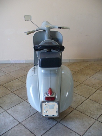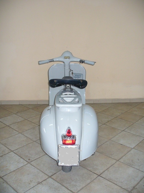 la pancia era ammaccata e graffiata, all interno un pò di ruggine, l ho sistemata e verniciata del suo colore, lo specchietto era saldato alla vite del manubrio!!! levato, e perno del manubrio sostituito, il clacson e la scritta "vespa" di colore sbagliato, grigi invice di neri, cambiati anche quelli, manopole cambiate.. e adesivi tolti... il faro posteriore era quello suo in metallo siem, la plastica rossa era spaccata e lo stop non funzionava.. la ruota di scorta e il cuscino passeggero li ho tolti per fare le foto per l FMI.. |
