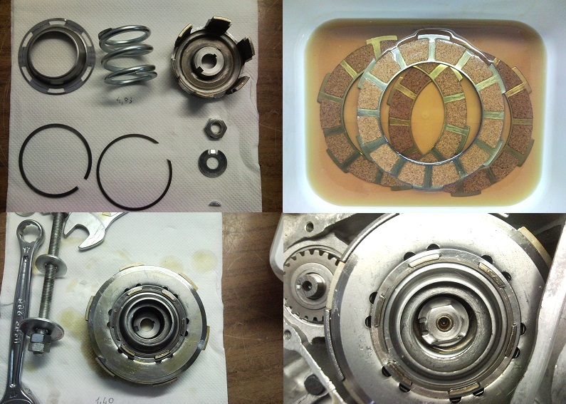 Nella prima foto, in alto a sx, è possibile vedere la molla rinforzata che ha un diametro della spira di 4,83mm; il cestello preso usato perché ho dovuto sostituire il mio che si era rovinato con lo schiavettamento e l'anello seeger di chiusura della frizione in acciaio temprato DRT, che ha uno spessore di 2 decimi di millimetro maggiore rispetto all'originale. Nella seconda foto si vedono i dischi che hanno fatto un bel bagnetto di un giorno nell'80/90. Nella terza foto si vede la frizione chiusa (notare l'attrezzo spingidischi fatto in casa). E, infine, la frizione montata. |