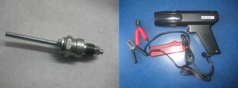 Però adesso, veniamo alle dolenti note... Penso che la cosa più semplice da fare per spiegarvi la situazione in cui mi ritrovo, sia raccontarvi tutto quello che ho fatto su questo benedetto motore. Per prima cosa ho regolato le puntine, la loro apertura adesso è compresa tra 0,3 e 0,4mm, misurati con lo spessimetro. Poi ho costruito un bloccapistone, eccolo insieme alla strobo: