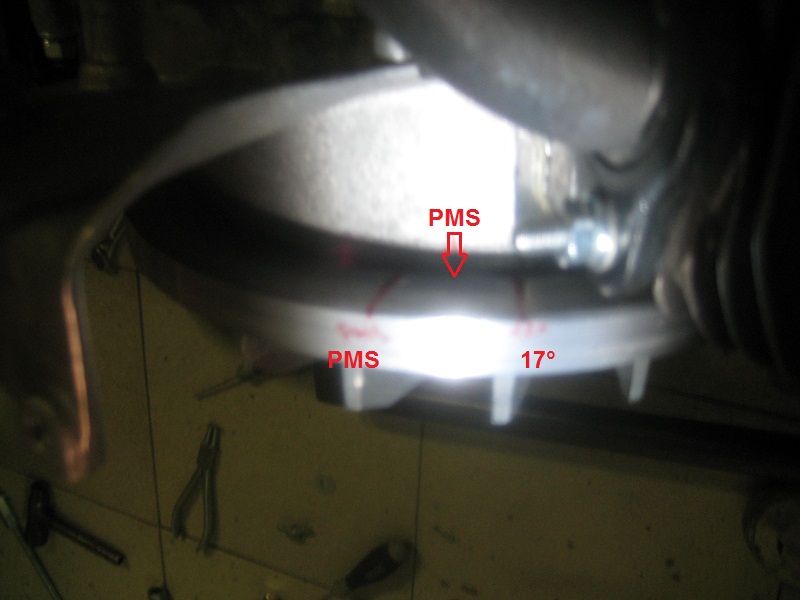 In seguito ho trovato il PMS ed ho fatto un segno sul volano ed uno sul carter, poi ho contato 17° ruotando il volano in senso antiorario e ho ho fatto un altro segno. Poi ho collegato la strobo e ho verificato il mio anticipo. Era esattamente a metà strada tra il PMS e 17°, quindi intorno ai 9°. Eccolo in foto mentre uso la strobo: