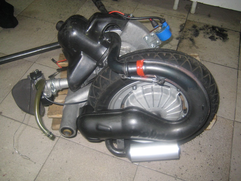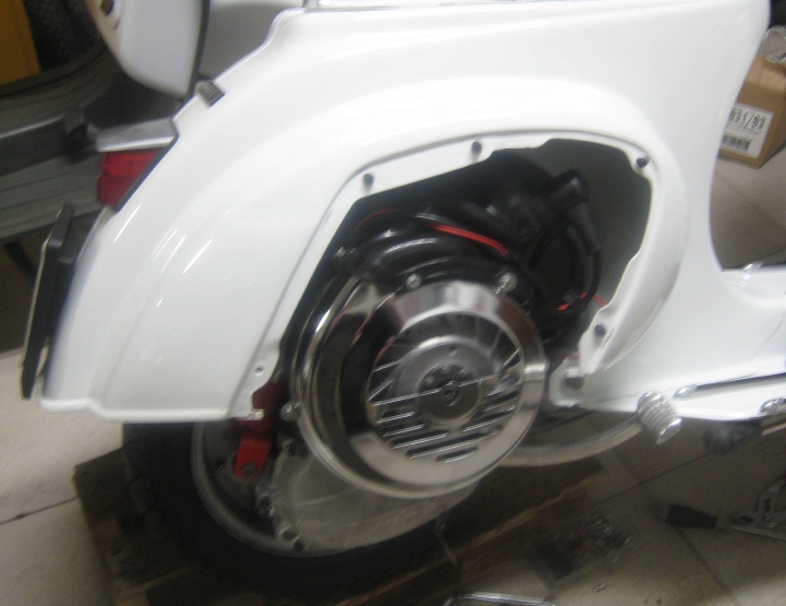 Oggi pomeriggio ho iniziato a mettere il motore sotto al telaio. All'inizio ho montato il tamburo e la ruota. Poi, nel punto in cui la marmitta si infila nel collettore di scarico ho messo un po' di pasta rossa, infatti da quel punto avevo sempre un po' di trafilamenti di miscela incombusta... Non sono sicuro che la pasta rossa tenga, ma devo dirvi che forse la prossima settimana avro sotto mano una polini cannone e quindi questa banana e la sua guarnizione dovranno resistere per poco... Dopo ho montato la cuffia originale e il copriventola cromato.