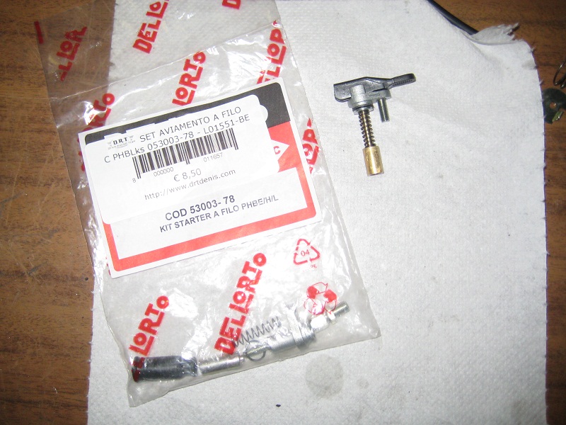 Poi ho messo il motore sotto al telaio; per sistemare il soffietto che fa da guarnizione tra vaschetta del carburatore e vano motore ci ho messo una vita, ma alla fine è venuto un lavoro pulito; inoltre ho fatto una piccola modifica al carburatore installando il kit originale dell'orto di avviamento a filo per poter togliere la scomoda levetta dell'aria e avere di nuovo il comando dell'aria originale della special (ho dovuto adattare la guaina del filo dell'aria perchè era troppo lunga, ma alla fine è venuto un bel lavoro).