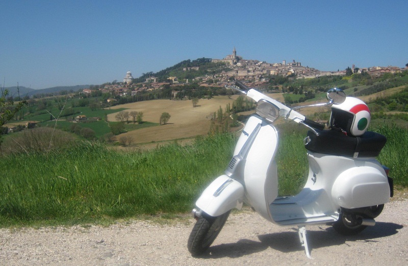 Ragazzi, stamattina ho finito di regolare la tensione dei cavi del cambio, ho tirato il cavo della frizione, un paio di prove lungo la corsia dei garage, poi ho fatto il primo pieno e via!  L'intento era di fare un giretto intorno a casa per vedere come andava.. Dopo i primi due chilometri ho notato con sorpresa che, nonostate abbia tarato entrambi gli ammortizzatori alla massima rigidità, le vibrazioni sono quasi sparite rispetto a prima.  Ai bassi è meno nervosa di prima, l'asportazione della valvola ha tolto anche il brusco ingresso in coppia che c'era prima. Ora è molto più regolare e modulabile. A vantaggio della guidabilità. Il cambio è un po' duro, dovrò tirare ancora un po' i cavi per averlo più preciso. Invece la frizione va bene, è leggermente dura da tirare, ma la leva del carterno lunga e le manopole px aiutano a comprimere la molla malossi. Dando il gas tutto insieme sembra affogarsi, sicuramente sono grasso, come getto del max ho il 110. Allora devo stare attendo a modulare bene la manopola, però in questi primissimi chilometri voglio andarci piano, ancora la vespa è fredda... Passo un attimo sotto casa della mia ragazza a farle vedere il bolide dalla finestra e poi via! continuo il mio giretto, fatti i primi 7/8 km, provo ad tirare un pelo le marce.. cavolo! la seconda tira bene..  La terza sembra infinita, sono già a 80 km/h (da tachimetro) in terza e non posso neanche aprire tutto il gas perché sono in rodaggio.. gli butto la quarta su un rettilineo in lieve pendio ci mette un paio di secondi ad entrare in coppia, forse è un po' lunga la quarta, ma in verità la terza non l'ho tirata tutta.. Senza neanche accorgermene ho già superato la periferia e mi accingo a prendere la strada che porta a Sangemini, un paese molto carino, famoso per le sue acque minerali, che si trova a 15 km da casa mia, insomma, mi aspettano 5km di curve in salita.. Il motore si sta scaldando, lo sento che risponde sempre meglio ed io mi sto abituando a dare il gas in modo regolare e non brusco per non affogarlo, supero di slancio la porta del paese e mi accingo ad andare verso il negozio di mio padre che si trova a 10km da Sangemini. In negozio c'è mia sorella, le faccio fare un giro e mentre passiamo dentro alla piazzetta del paese mi dice: "Si girano tutti a guardarla, eh?" io inorgoglito penso, oltre alla bellezza questa vespa ha anche un bel motore e gli dò una sgasata per farmi sentire!  Riporto mia sorella in negozio e riparto per le strade di collina tra la provincia di Terni e Perugia. Pian, piano mi allontano sempre più da casa, ho già fatto 30km, ma la vespa c'è la sento giusta e continuo ad andare avanti dando sempre un po' di gas in più. Che bella giornata di sole! I saliscendi delle colline sono perfetti per provare la vespa in tutte le condizioni, inoltre esaltano il piacere di guida. mi ritrovo di fronte ad un dosso, lo supero con la terza aperta a tre quarti di gas, poi la discesa, rettilinea, lunga e libera, butto la quarta, adesso la tiro, 90km/h, il tachimetro oscilla, 100km/h, la vespa è una spada, arrivo a superare i 110km/h di tachimetro in discesa senza aver aperto tutto il gas, stavolta non perché sono in rodaggio, ma solo perché sono grasso e al massimo si affoga. Tolgo il gas e stavolta provo i freni, certo, sulla vespa non dovrebbero essere neanche definiti freni, sono più che altro dei "modulatori di velocità", però fanno il loro sporco lavoro e grazie alle molle rigide la vespa non si scompone e non affonda all'anteriore. D'un tratto mi ritrovo a Todi, in piena provincia di Perugia. Il giretto sotto casa per il rodaggio è diventato la gita più lontana che io abbia mai fatto con la vespa! Ecco una cartolina del panorama sulla strda che porta alla città di Todi: