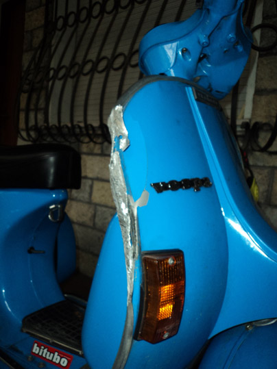 Uscita serale del primo dell'anno per smaltire il mal di testa e la cotta della notte con gli amici; strada lunga, senza luci e macchine. Li lascio 5 minuti per fare una tirata e vedere la candela com'era (vi ricordate che ho appena montato il PHBH??). Faccio tutto il rettilineo sparato a palla, arrivo in fondo, mi giro, riparto. Prima... Seconda... Terza... Lascio un attimo la presa con la sinistra per abbassare la visiera del casco, in quell'istante sono passato su una profonda buca dello stesso colore dell'asfalto, molto difficile da notare. La Vespa la conoscete, se non la tenete saldamente vi parte come niente in questi casi, io con una sola mano sul manubrio a 70 km/h circa non ho potuto fare niente: il manubrio si è strattonato a destra e sinistra e di colpo mi sono trovato per terra a strisciare, riuscendo a scorgere per un attimo la fiamma che lambiva lo scudo destro... Si stavolta ho voluto cadere a destra per non rovinare la simmetria dell'insieme! I miei amici che erano a 800 metri (dall'altra parte del rettilineo) hanno detto che hanno sentito TUTTO la Vespa che prendeva giri, poi all'improvviso una sfollata (che non ricordo) e poi il rumore della lamiera che raschiava l'asfalto. Sono arrivati subito ma per fortuna io ho solo strappato il giubbotto e un pò i pantaoni dalla parte delle chiavi, quella di casa si è un pò rovinata  Per terra dove c'è stato il primo impatto c'è un solco profondo un 1 cm se non di più lungo 1 metro dove ha toccato la pedalina! Abbiamo contato da lì fino a dove è atterrata la Vespa: 78 metri!!!