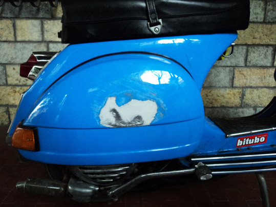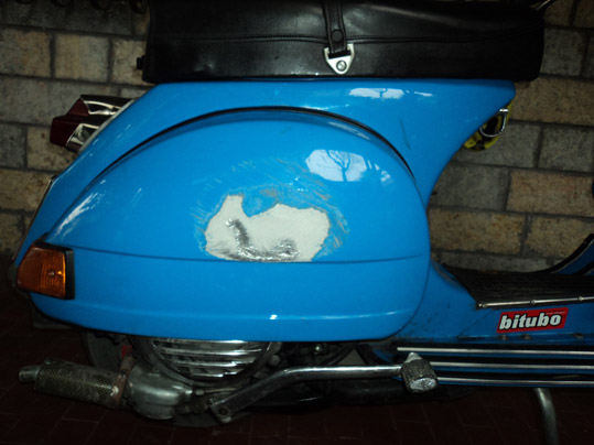 Caxxo è vero nel cadere ho una certa eleganza! E' vero che conservo la calma e guardo sempre la Vespa dove va a finire! Poeta ti faccio vedere la foto del primo impatto con l'asfalto, c'è un solco profondo 1 cm se non di più dato dalla pedalina che ha strisciato!!! Poi quei 78 metri di volo... La Vespa li ha sentiti, io no  |