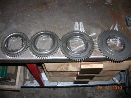 Quando li monti devi fare attenzione che fra 1° e 2° ci sia lo spazio del FOLLE per i denti della crocera. Deve esserci lo spazio per uno scatto, non puoi sbagliare! Se fai caso quei due ingranaggi hanno la parte centrale più spostata da un lato proprio per lasciare questo spazio. Se non ricordo male la 1° ha le scritte verso il volano, tutte le altre sono opposte. |