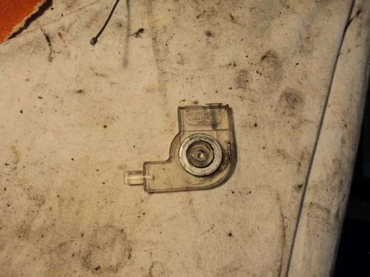 Allora ho adottato questo sistema con la ranella di diametro interno uguale a quello della sporgenza del tettino trasparente in modo che vi si infili perfettamente e il filo quando esce continua a scorrere su di essa; il gas è più duro e meno pronto ma consente di continuare a girare....