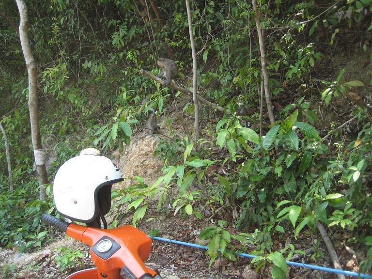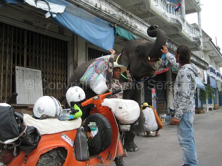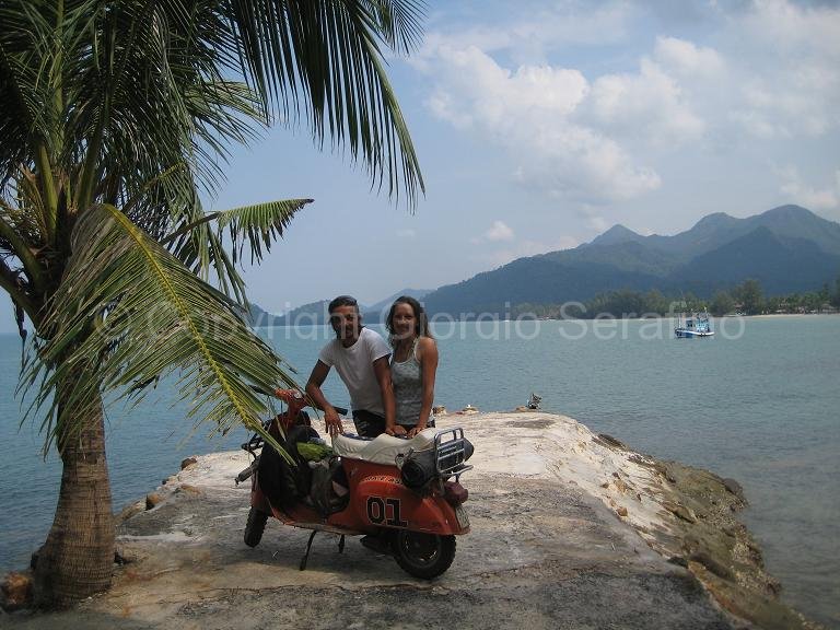 Appena passato il confine ed entrati in thailandia, la bussola del Generale punta verso sud, verso il golfo della Thalandia…………. Ci fermiamo a dormire in un paesino di cui non ricordo il nome. Il giorno dopo la gentilezza dei thailandesi, supera normalità. Siamo fermi di fianco alla strada, tranquillamente fumiamo una sigaretta mentre aspettiamo che il Generale si raffreddi, quando si ferma una macchina ed esce una donna stranamente con i capelli tinti di biondo, vuole aiutarci a risolvere il nostro problema…………….. Ma noi non abbiamo un problema, apparte lei che non parla inglese, cosi telefona alla sorella, a cui spiego che stiamo soltanto fumando una sigaretta, lei dice di aver capito, cosi le ripasso la sorella, che dopo pochi secondi mi rida’ il telefono, ricominciamo a spiegargli tutto e finalmente sembra aver capito e rientra in macchina. Poi ricomincia da dentro la macchina, la sorella mi dice che anche se non ho problemi è meglio che ci accompagna lei verso il mare……….. Alla fine sfiniti accettiamo, “tanto ce la perdiamo per strada” dico io! Ma niente da fare, si ferma ad aspettarci con la testa fuori dal finestrino insistendo che dobbiamo seguirla, ma per dove poi ? Che dove vogliamo andare non lo sappiamo neanche noi! Cosi al primo semaforo riesco a passare davanti alla fila e in una vietta ci nascondiamo dietro una siepe….. Non sarà stato molto carino , ma non sapevamo come farle capire che non avevamo una meta precisa ……….. Comunque la meta arriva 4 incroci dopo quando vediamo il cartello che indica l’isola di Kho Chang! Carichiamo il generale sulla barca e in 45 minuti siamo sull’isola e un tuffo nelle acque calde del golfo è il modo migliore per toglierci di dosso la polvere, avrei potuto immaginare di nuotare con dei pesci, magari incontrare un delfino, invece no, abbiamo nuotato insieme a due elefantini di un anno e tre mesi, uno mi ha anche abbracciato con la proboscide, mettendomela intorno al collo e portandomi a se! CHE FIGATA!!!!!!!!