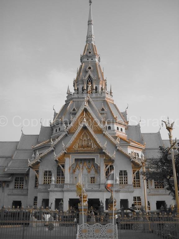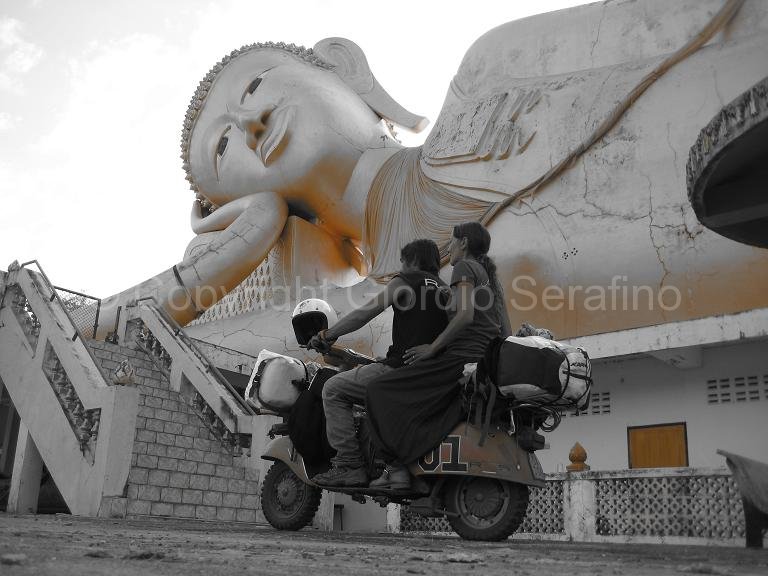 Appena rientrati dalla Cambogia, cercavamo sulla mappa le stradine piu’ piccole, ma anche quelle ….tutte asfaltate, cosi’ Stiamo girando completamente a caso per la Thailandia, stiamo dormendo in paesi che non sono nominati in nessuna guida, ad ogni incrocio è il caso a decidere, oppure il nome di un posto che magari ispira più di un altro! Andare e basta…….. E il Generale dice la sua ,e per due volte ci ha condotto in 2 paesi molto carini, ma ora non ricordo il nome, incontriamo gente vera, che usa ancora l’elefante per trasportare le loro cose, mercati frequentati da gente del posto e dove gli unici “bianchi” siamo noi. Il Generale si confonde con l’arancione dei monaci e risalta con l’oro dei Budda, distesi o seduti, immensi dominano colline intere, le canzoni dei monaci invadono l’aria con un ritmo ipnotico, e ancora monaci che si lavano nei fiumi o passano nelle vie benedicendo e ricevendo offerte. Ogni volta che ci fermiamo per strada, anche solo per mettere la miscela ci sono sempre due o tre persone che si avvicinano timidamente ed incuriositi e mettono la testa quasi dentro il serbatoio e poi si fermano a guardare finchè non andiamo via, tipo i pensionati che da noi guardano i lavori in corso………………. Spingo il generale fino alla fine, ancora e ancora e ancora finchè non vedo il sole che tramonta davanti a noi e vorrei raggiungerlo e tuffarmici dentro per avere ancora qualche minuto, per continuare la corsa verso una meta che non esiste o che semplicemente non voglio!
