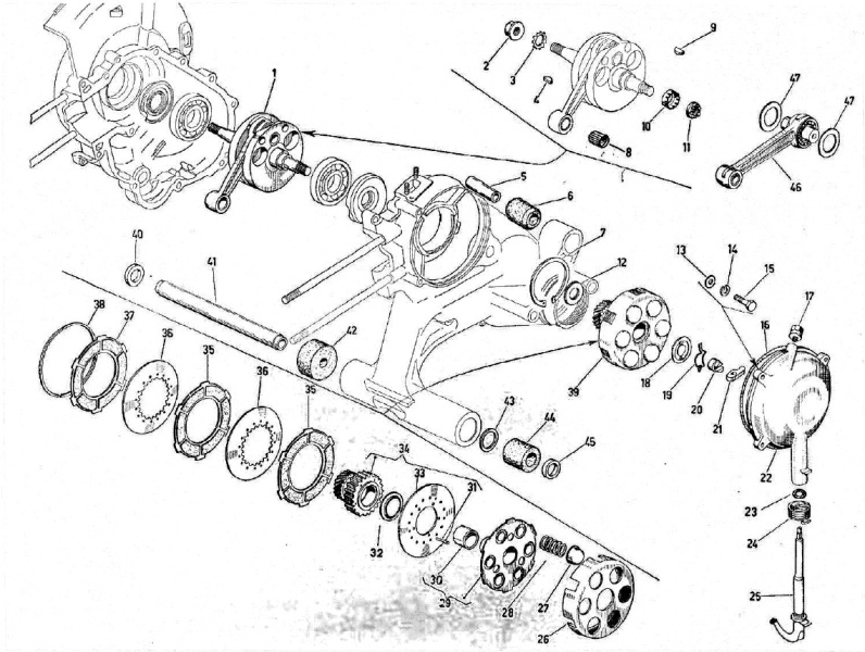 ho la vespa che mi perde olio in continuazione,facendo una pulita ai carter mi sono accorto che la goccia scorre da sotto alla leva di tiro della frizza(25),sabato sono andato dal ricambista ho preso 2 guarnizioni nuove,la 16 e la 23 e le ho cambiate.