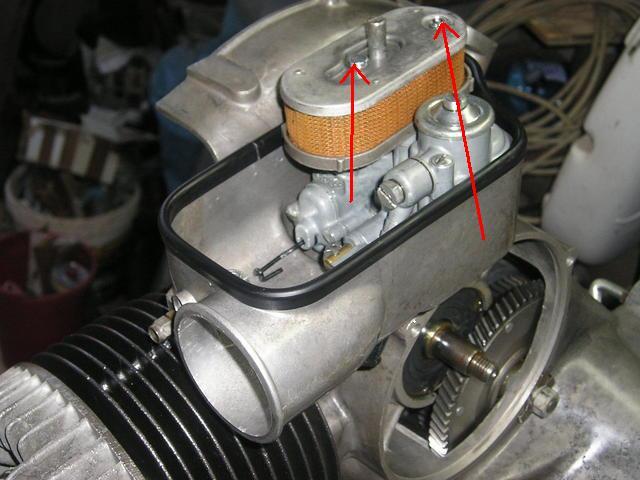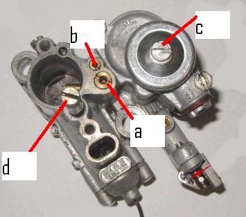 togli le due viti nere laterali al coperchio del carburo, quella sopra centrale che esce fuori non la toccare, quella regola il minimo, togli il coperchio facendolo salire pari pari e ti appare cosi (le foto le ho trovate in rete, qui è visto dal lato opposto ma la cosa non cambia)
