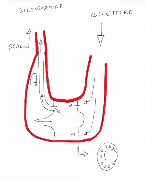 la polini a serpentone dentro è un gran casino, ho aperto la mia tempo fa perchè volevo liberarla un po' senza svuotarla tutta ma ho rinunciato per quanto era complicata... meglio orientarsi su altra marmitta. Fra l'altro far uscire tutti i residui è arduo come in un padellino... In pratica il collettore immette nella prima camera (cono di espansione molto breve) che ha come fondo una prima paratia bombata al centro e contornata da una corona di piccoli fori che immettono nella seconda camera (parte centrale cilindrica), che ha come fondo se ben ricordo un imbuto che dà adito al controcono, ma, curiosamente il controcono non si continua nel tubo di scarico bensì è a fondo cieco, perchè il tubo di scarico va a pescare, attraverso un lungo tubo alquanto sottile, nella camera centrale (sbocca a lato dell'imbuto). ecco uno schema disegnato a mano.