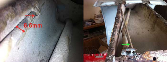 La canaletta del freno posteriore è larga 6,5 mm, nella parte finale è talmente marcia che arriva a 4 mm di diametro. Non ci può passare nessuna guaina, infatti c'era solo il filo. 1) Mi confermate che anche il filo del freno posteriore aveva la guaina? 2) Sapete dirmi che diametro ha questa canaletta ? 3) Quel buco segnato con la frecetta rossa è normale che ci sia, non lascia entrare acqua e altro che poi danneggerà l'interno?