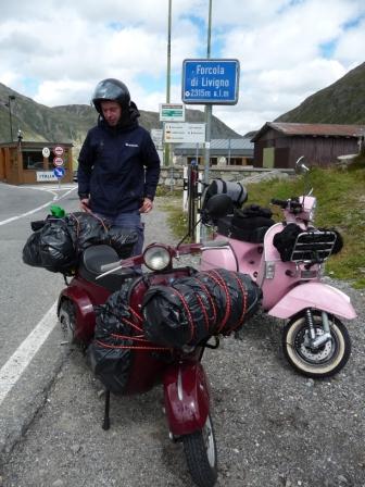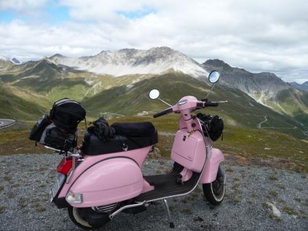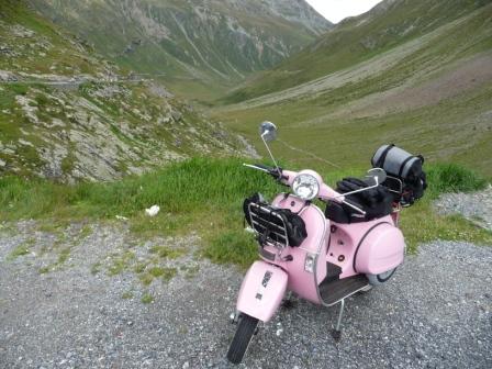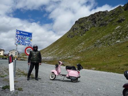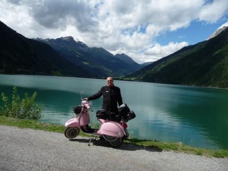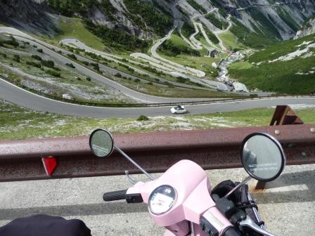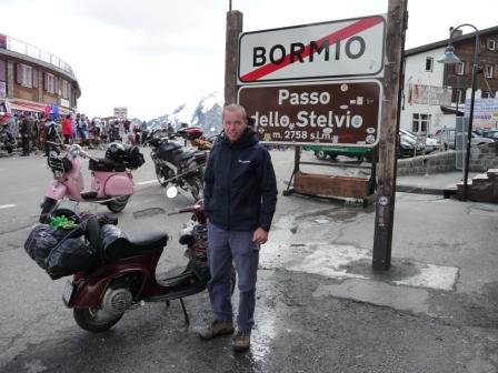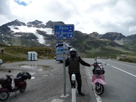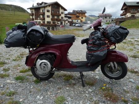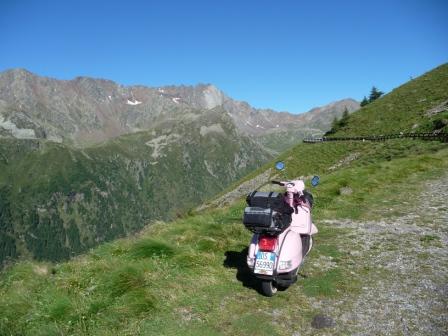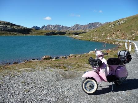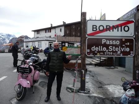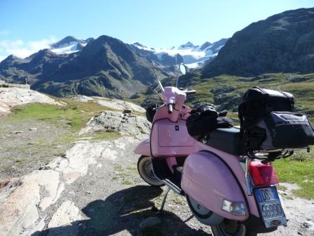 Arrivato al Gavia, fa un freddo boia, la foto di rito, la foto al laghetto e al ghiacciaio del gruppo dell'Ortles e via verso Bormio e si inizia a rampicare sullo Stelvio. Al passo incontro un ragazzo italiano con una 50 R stracarica. E' in giro da parecchi giorni. Questo mi fa pensare che l'epopea del turismo in vespa senza grandi prestazioni, ma con grande capacita' di adattamento non e' ancora scomparso!  Decidiamo di fare un pezzo di strada assieme. Purtroppo e' l'unica Vespa incontrata in 430 km...