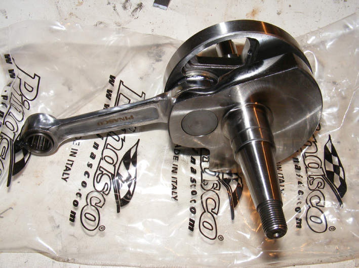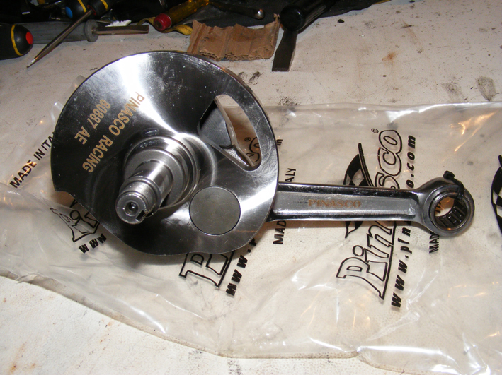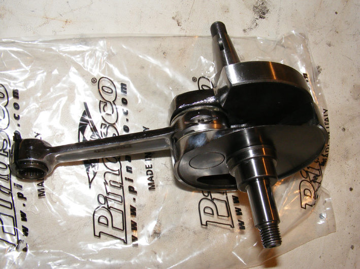 | questi alberi pinasco sono capolavori, a parte a volte qualche piccolezza nelle rifiniture, ma biella ed imbiellaggio sono molto robusti, come i materiali in genere, e notate l'ampia voragine per il passaggio della miscela fra le spalle, grazie alla spalla di tenuta a "lama di coltello" (si vede nella terza foto). Da quando ci sono questi alberi in commercio consiglio solo e sempre loro. |