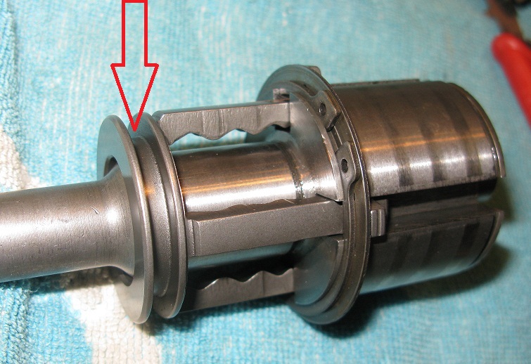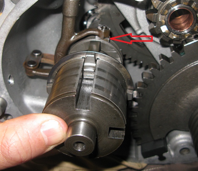 Ho deciso di montare la campana in questione quindi ho inserito l'albero del cambio nell suo cuscinetto. Peccato che nessuno abbia saputo dare risposte alle mie domande. Allora: diciamo che per inserire l'albero del cambio non ho trovato una spiegazione esaustiva in nessuna guida quindi mi sono dovuto arrangiare . Il problema essenziale è quello di dovere necessariamente inserire i pattini della forcella del cambio, dentro la sede anulare dell'innesto marce e nel frattempo inserire l'asse all'interno del cuscinetto. Per fare tutto questo, bisogna operare in questa maniera: Prendere l'albero motore senza aver messo gli ingranaggi, e spostare l'innesto marce tutto verso fuori come in questa foto. La freccia indica la sede anulare dell'innesto dove devono entrare i pattini della forcella:
