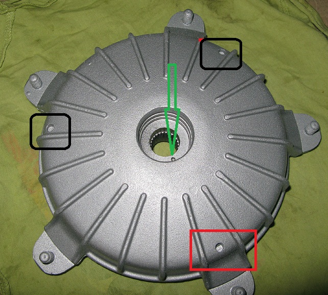 129,57 KB raccordo montato con rondella spaccata e dado da 10. Bisogna serrare i dadi del raccordo ammissione a 0,8-1 KGM cioè a7,848. 9,81 NM. Riguardo al tamburo, in pratica, dato che ne ho visti 5 non originali compreso il mio, ho tirato la conclusione che nel tamburo non originale i 3 fori sono tutti e tre al centro come quello evidenziato in rosso. Poi il forellino evidenziato in verde, non è presente in quelli non originali.
