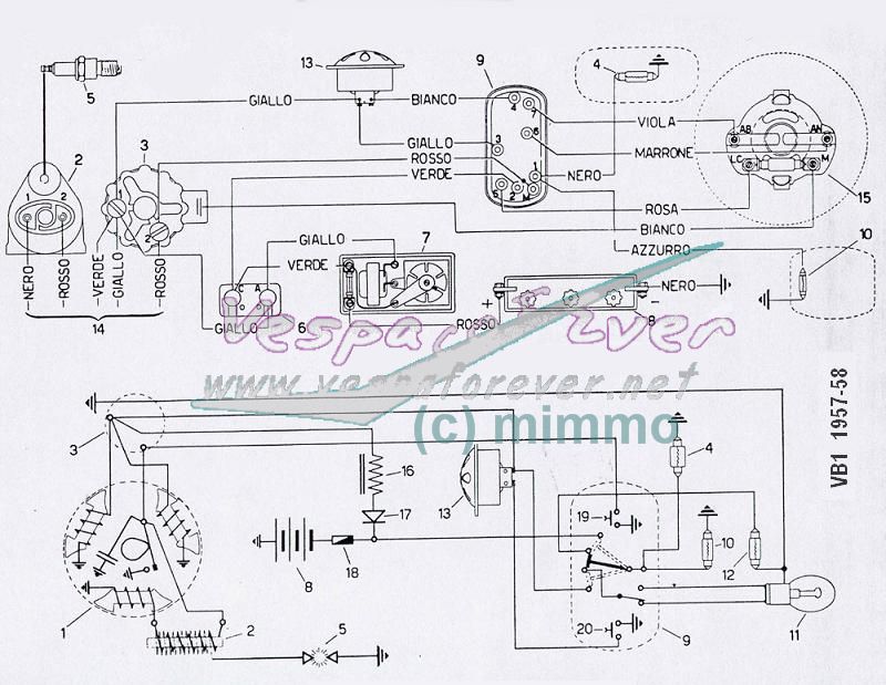 Ciao a tutti, era un po' che non entravo nel forum e voglio fare i complimenti a Dorna per i lavori di restauro e meccanica!! ho anch'io una VB1 del '58.... una meraviglia!!! Volevo chiedere a Dorna la gentilezza di spiegarmi come si fa la modifica per inserire l'interruttore per la luce dello stop e da dove ha fatto passare i fili che vanno all'interruttore. allego lo schema dell'impianto della VB1 con i colori. da quale filo devo partire per andare all'interruttore e come arrivo al fanalino posteriore.