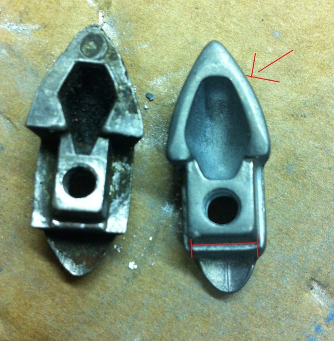 quì vediamo la parte evidenziata dalle barrette rosse molto più larga dell'original tanto è che non si infilano sulle leiste pedana.....poi la punta è totalmente differente...