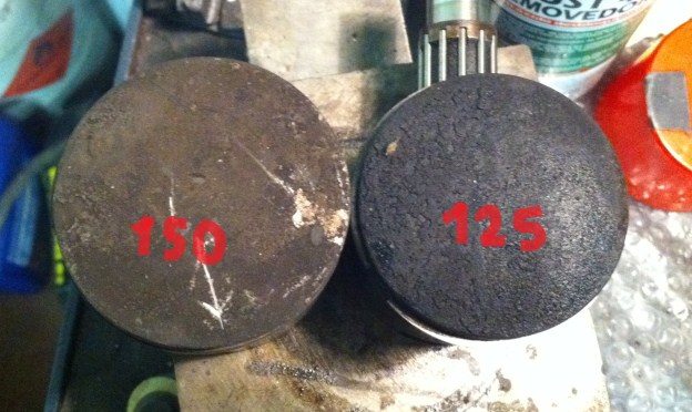 Per il motore no problem in basso ti metto le foto del pistone 125 accanto al 150 e si vede ad occhio, la testa poi ha lo stemma quadrato.