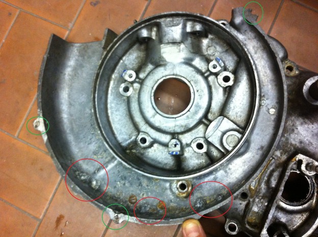 90,44 KB a parte le varia grattate di cadute ho evidenziato in verde gl'occhielli o che mancano oppure con le viti spezzate all'interno e riforati amembro di cane non sò da quale bbestia..... cosa ancora più grave sono quei difetti cerchiati in rosso ti metto una foto più da vicino