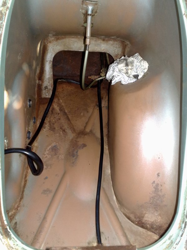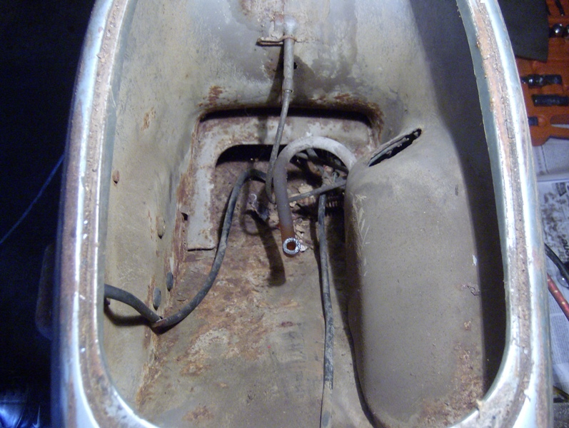 Sembra che in quel tunnel ci aveva fatto su casa un Topolino.........povero lo hai sfrattato. Il tunnel non sembra marcio, potresti eliminare la ruggine facendoci scorrere dentro EVAPO-RUST con una piccola pompa elettrica........a Vespa capovolta, recuperi il colato dal cannotto sterzo e lo rimandi in circolo. Quarda l'inizio del mio restauro, il risultato che ottieni e' piu' o meno quello.