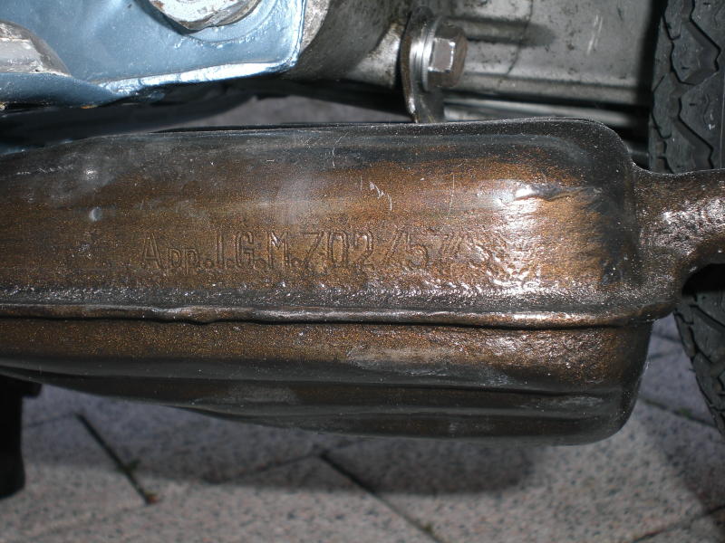 ********************************************* quotissimo  A conferma ti allego foto della mia per la sigla di omolog. sulla marmitta : 1. per le prime (1958-59) veniva riportato App. IGM 702/87/S 2. per le successive (1960) era riportato IGM 0112S (del resto per la vba eistono due differenti schede tecniche omologative)