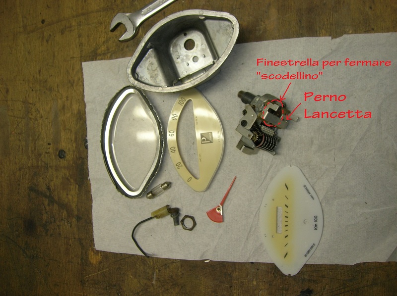 La lancetta è fissata a pressione su un piccolo pernetto solidale ad uno "scodellino". Dalla foto si capisce (E' quello indicato in rosso di forma circolare). Se tu tenti di far girare la lancetta senza tenere fermo nulla non accade niente in quanto lo scodellino di latta al quale la lancetta è fissata non è solidale a nulla ma viene azionato magneticamente di conseguenza muovi in senso orario o antiorario la lancetta e si trascina dietro lo scodellino in latta di conseguenza chiaramente non si schioda. Guarda bene il contachilometri, se noti tra il fondo ed il meccanisco, nella parte retrostante vedrai una piccola finestrella dalla quale intravedi lo scodellino in latta di cui ti ho parlato. A scanso di equivoci muovi la lancetta avanti e lasciala ritornare a zero e lo individui immediatamente in quanto al muoversi della lacetta pure lo scodellino in latta ruota. Ecco, dalla fessura che intravedi blocca questo scodellino. Puoi usare un cacciavite da orologiaio, uno stizzicadenti, il mignolo del dito, di tutto. A scodellino fermo forza la lancetta in senso orario (come se stessi accelerando) e viene via in un attimo. Garantito. E' davvero una scemenza... |