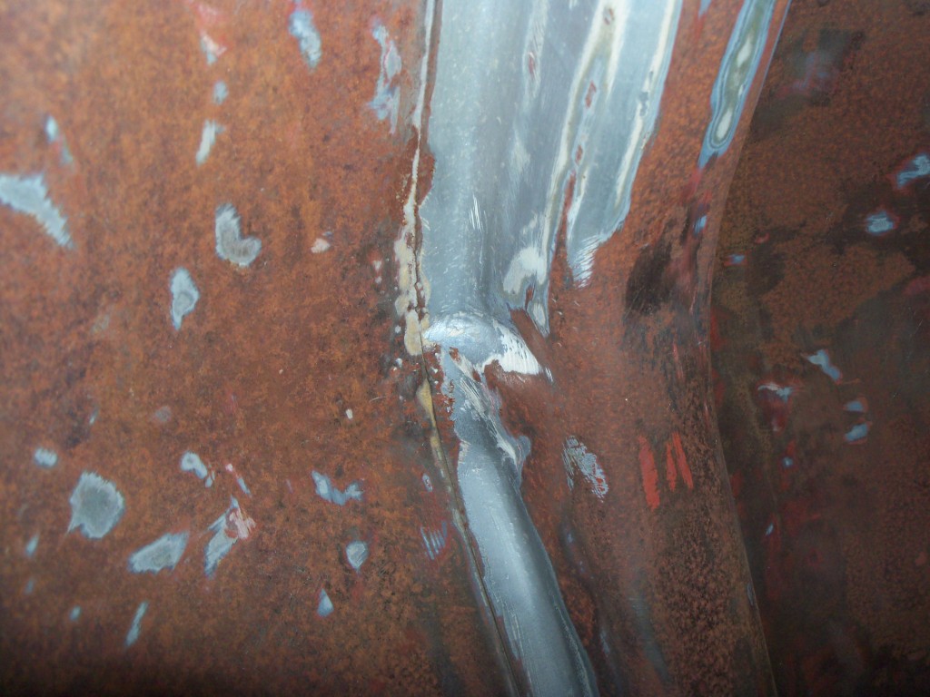 una veduta d'insieme della pancia che a me pare in buone condizioni eccezion fatta per la prima nervatura (quella a sinistra) che e' schiacciata probabilmente a causa di colpi ricevuti nell'uso e parzialmente corrosa dalla ruggine. si puo' sistemare o va sostituita (come?)