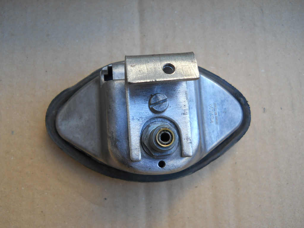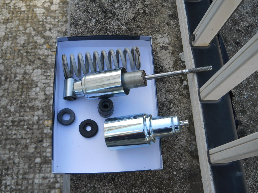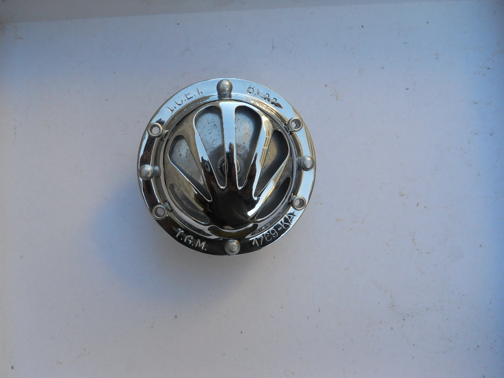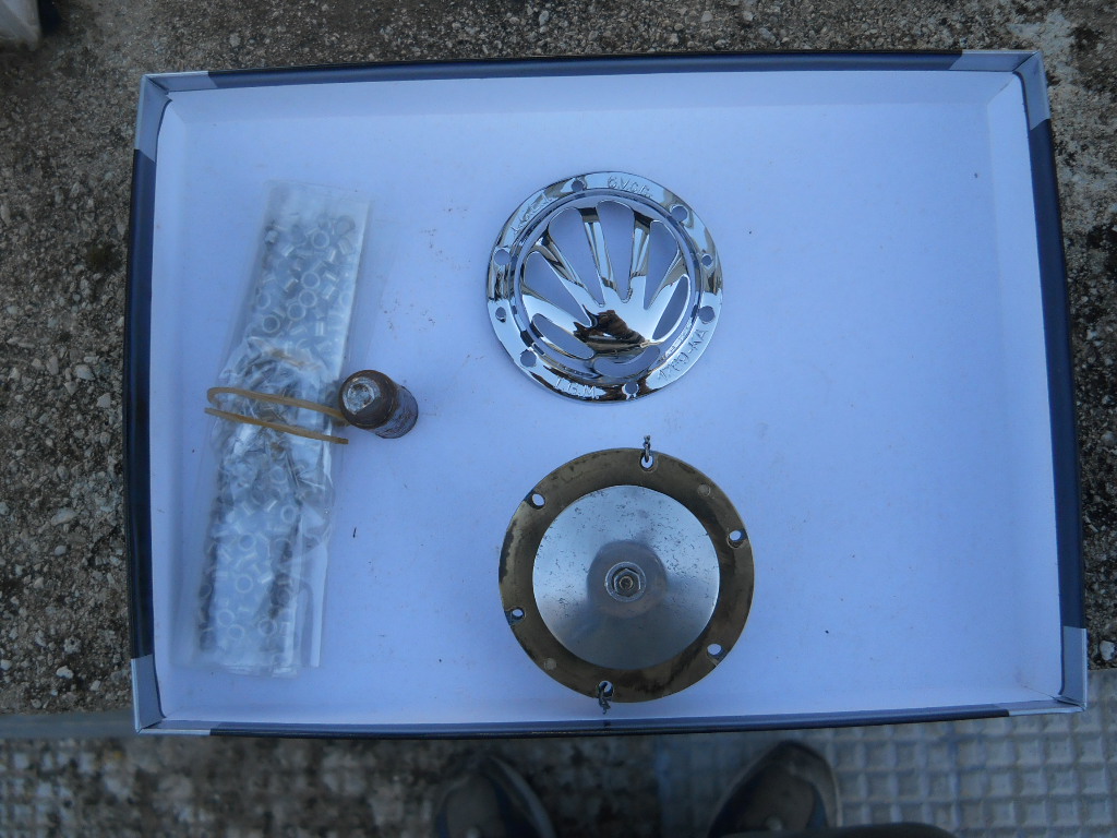 | Il kit revisione ammortizzatore io non l'ho mai visto nonostante lo abbia cercato,è un mio amico che ha qualche gommino di tenuta di varie misure,ci mette l'olio idraulico nuovo e me lo prova lui;il clacson originale era cosi' con i quattro ribattini in alluminio e i quattro occhielli sotto le viti,un mio amico(sono fortunato perchè ho tanti amici che sanno fare tante cose)ha gli stessi ribattini,mi ha costruito un punzone tagliato da un lato(si vede nella foto),altrimenti urta e rovina il ventaglio cromato e li ribatto,gli occhielli li ho trovati a fortuna tempo fa e cosi' è molto piu' bello di quelli che vendono rifatti che sono diversi anche come spessore |