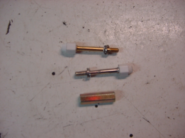 queste invece sono spine per relè ferroviari FS58, non credo che le trovate in commercio, potete usare al loro posto normali pomelli con vite metrica da 4; in ogni ferramenta si trovano normalmente. In basso si nota una delle due torrette filettate da 4 mm Immagine: