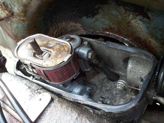 Ora invece un'altra curiosità... Il coperchio del carburatore... Nella parte in vista troviamo il classico nero raggrinzante, ma sotto abbiamo una sorpresa... Nessun fondo!