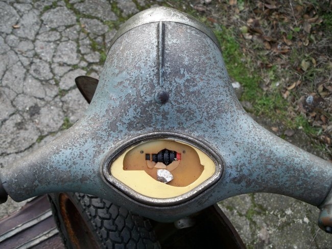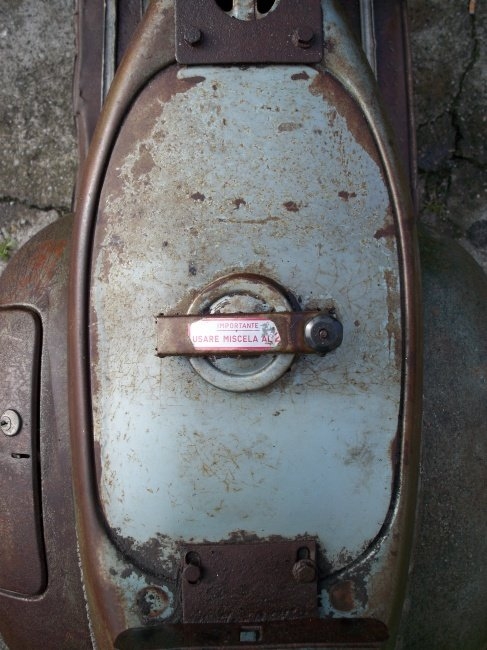 i tamburi li ho fotografati... sono entrambi al naturale ... Il mozzo invece è in tinta... lo strumento purtroppo è l'unica cosa andata distrutta nella vespa, comunque è il classico della vba, ovvero quello a ventaglio scalato 100 km/h con le caselline del chilometraggio separate... è specifico per la vba, nessun altra vespa lo ha montato... simile lo aveva la gs vs5 (fino agli ultimi mesi del 1960) ma quello era scalato 120 km/h... per la pedivella sono d'accordo, nel senso che si sa che la vba usciva con quella pedivella... PERO' io non ho mai trovato la pedivella con il gommino su una VBA conservata... quella del mio amico purtroppo mi sono proprio scordato di guardarla, dovrò tornarci... Il rubinetto non l'ho fotografato perchè pensavo fosse ormai una cosa certa che la VBA montasse quello senza decantatore, ma hai fatto bene a dirmelo così fotografo pure quello  |