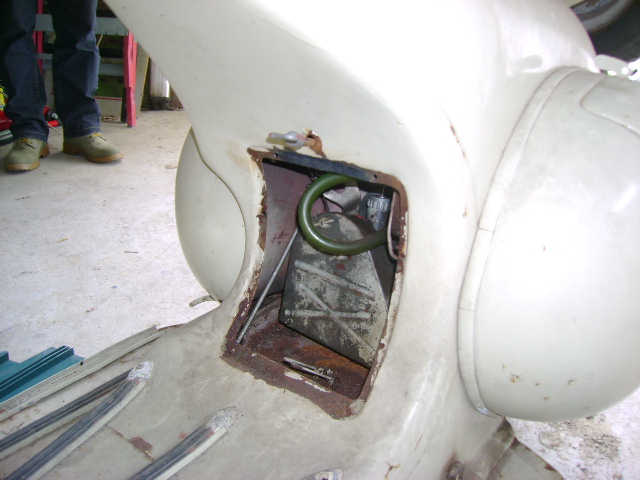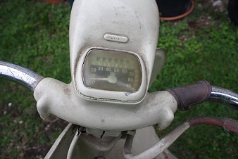 il portabollo è chiuso a pressione ... vedo di aprirlo appena posso e farti una foto ... il bollo mi sembra sia del 66. La vespa è riverniciata penso del colore originale ma va a mio avviso comunque sabbiata. Non ha ruggine passante ma comunque andrebbe riverniciata
