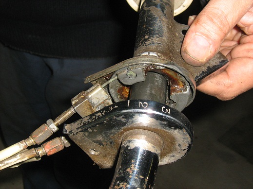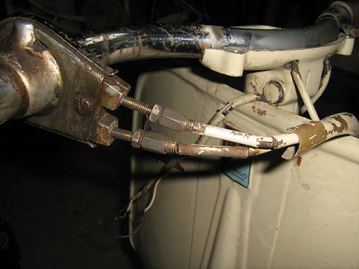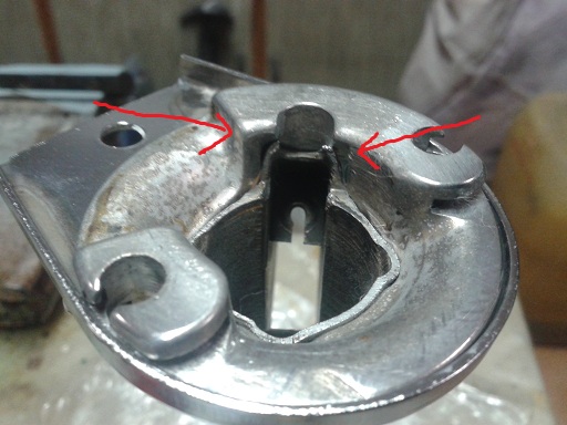 se però dovete ricromare ricordate che tutti i pezzi sono di ferro (e quindi da cromare) tranne il manicotto a tronco di cono nella parte sinistra del manubrio che è di alluminio (che va lucidato a specchio) e che può essere separato dalla manopola sinistra del manubrio lasciando così uscire la piastrina del cambio piegando con un cacciavite le 2 alette di ferro interne che ho segnato con le frecce rosse Immagine:
